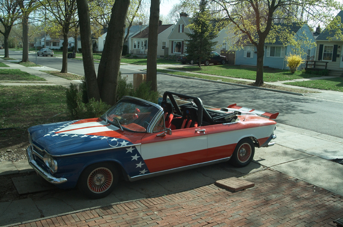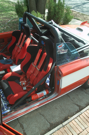 Here you can see the car in my driveway with the top down, (a rare occurrence). I think the bar fits and looks just fine in it. With the top up, the bar is just into the top. I wanted the bar as high as I could get it, so that my head would be at least an inch below the top of the bar as required by NHRA and IHRA rules.