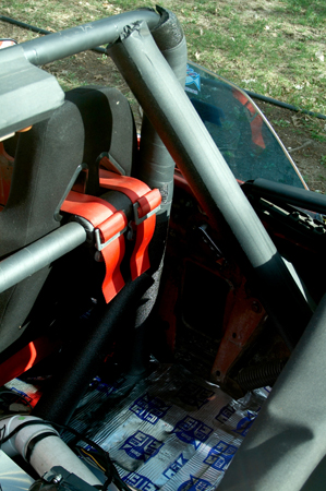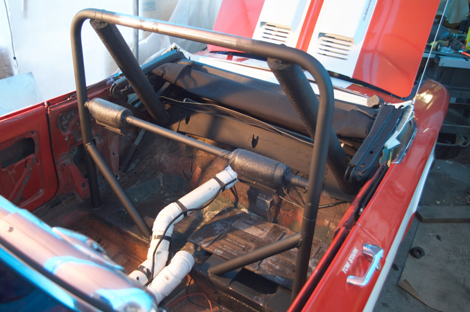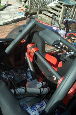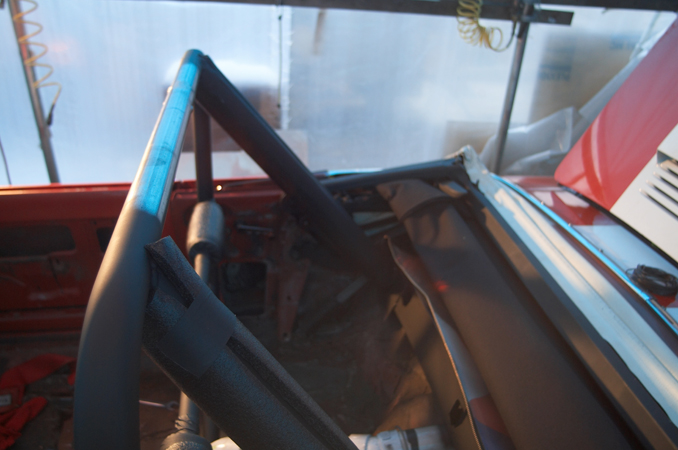 Here are some photos of the roll bar I am installing. Here it is only 6 points, I am adding 2 bars that will go forward along the sides of the front seats, for a total of 8 points on the bar. The bar is made of 1.75" DOM tubing that is .120" thick. This meets all rules by the NHRA and IHRA. The seat belt shoulder harnesses bolt onto the cross bar which is 1.25" DOM .120" thick. The mounting point is no more than 1" below the shoulders, as required by the rules.
