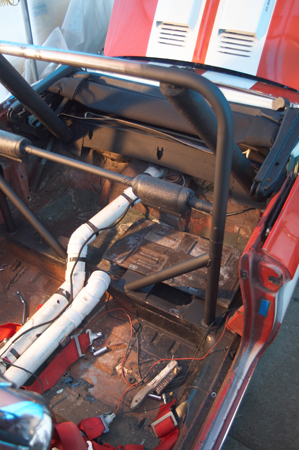 OK, here we are in April, and it is in the mid to upper 70's already! I love it! I have the roll bar finished, and the car back on the road. Here are some photos of the completed bar in the car. I need to pick up a little more roll bar padding, but other than that, it is done. I have the two bars going forward, the two rearward, and the two that go toward the center. All in all, this bar adds just over 80 pounds to the car. as you look at the photos, you can see the "Fat Mat" sound deadening that I am putting in the car. More weight, but the sound deadening is well worth it. I put a lot of miles on the car, around 8,000 each summer, toning down some of the resonate noise is well worth while. In case you are wondering what the box is in the middle of the back area, it is the A/C evaporator. A/C is important to me in any car. Nothing like being able to be comfortable in the heat of the summer.
