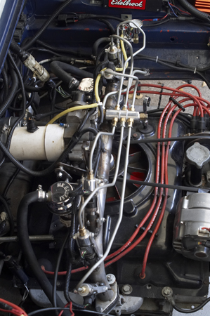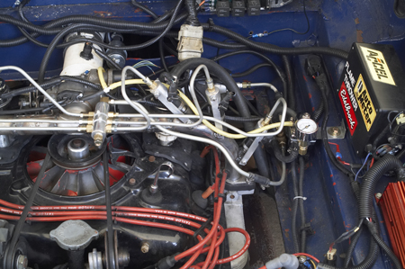 I have not even set the fuel maps yet, and it runs great with what I had "guessed" at. A little tweaking, and the idle is the best it has ever been. I am running 15.3# injectors at about 80 PSI, so they flow around 19#'s. The main reason for running so much pressure is that I really want the fuel atomized well with the injectors being placed one after the other as they are. It will take a few days of driving to tune this, and I am confident that when it is done, the car will be much quicker than it was before. I am hoping that with the new gear, (3.89 and 23.2" tires), and the EFI with its larger throttle body, (1.5 square inches of inlet area with carbs, and over 3 square inches of inlet area with EFI), that the car may make it into the 15's in the quarter. I know that does not sound that fast, but we are talking about a 2800# car, with a motor that was originally 110 HP GROSS, (closer to 75 or 80 net), and in stock trim would run 20 seconds or so.