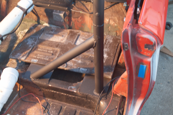 Here are some photos of the roll bar I am installing. Here it is only 6 points, I am adding 2 bars that will go forward along the sides of the front seats, for a total of 8 points on the bar. The bar is made of 1.75" DOM tubing that is .120" thick. This meets all rules by the NHRA and IHRA. The seat belt shoulder harnesses bolt onto the cross bar which is 1.25" DOM .120" thick. The mounting point is no more than 1" below the shoulders, as required by the rules.